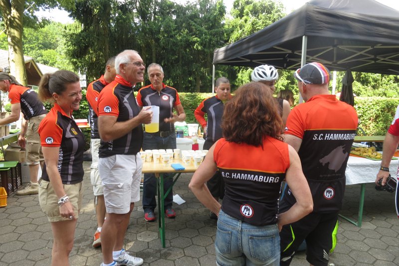 Gleich nach dem Start hatte eine schöne Gruppe gefunden und wir fuhren in guten harmonischem Tempo in Einerreihe wegen der schmalen kurvigen aber schöne Wegen. Und dann standen wir plötzlich auf einem Rübenacker. Naja, nicht ganz, aber der Weg war zu Ende. Hatten wir ein Schild übersehen, hatte ein Spaßvogel eins versteckt? Ich weiß es nicht. Auf alle Fälle waren wir nicht die einzige Gruppe, die falsch war. Auf dem Rückweg zu letzten Abzweigung trafen wir auf eine weitere verirrte/verwirrte Gruppe und gemeinsam fuhren wir im großen Verband zum ersten Depot nach Lütjensee, was wieder einmal hervorragend von den Hammaburgern bewirtschaftet wurde.
